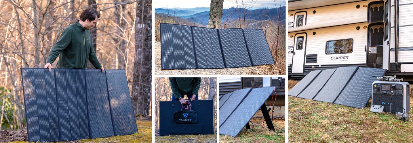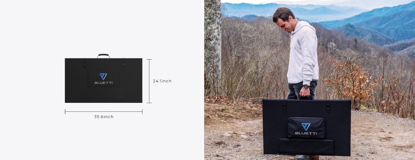 How big is BLUETTI PV350 350w solar panel? With a folded size of 35,6*24,1*2,5(folded) inches and 30,61lbs of weight, the BLUETTI PV350 is convenient to carry around and easy to be set up for anyone anywhere.