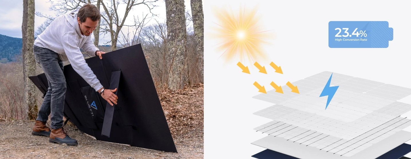 By generating renewable electricity from the sun's energy, BLUETTI PV350 solar panel is a reliable and budget-friendly power supplier to juice up your laptop, drone, fridge, electric drill, and other devices whether your're at home or on the go.
